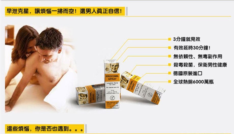 愛情涼了,女友跑了,你還不知道是因為你速度太快嗎?只需一瓶德國金剛持久液,讓你掌握自如,早洩煩惱一掃而空!PROCOMIL SPRAY德國金剛持久液特含活性分子,3分鐘見效,有效延時30分,無依賴性無副作用,德國原裝進口,全球熱銷8000萬瓶,銷售32週年仍然是火爆如初!德國黑金剛持久液,用時間證明愛,今晚就給她甜蜜暴擊,讓她爽,讓她嗨,讓她徹底被你征服!